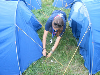 Hello everyone! Jen and Nicholle here at the Media Center in the main square of the camp. Our first day has been very exciting. Our plane ride was reallllllly long and mostly everyone, or watched Harry Potter! Once we landed we had our first injury, Jen got a severe nose bleed and Thuy-Linh got in trouble for getting more tissues while we were taxing into the Copenhagan Airport. Then we had 2-hour bus ride with NO AC, we rode with some scouts from France and Hong Kong. We walked a mile into our campsite, and started setting up, luckily our tents were already set up so we just had to rearrange them. We ate dinner at around 9, with the sun still up, we had hamburgers and stir-fry and rice. We met a bunch of people from all these different countries and some of us have already started trading neckerchiefs and patches. We had to sleep at 11 though, even though it was only 5pm Eastern Time. Some people had trouble last night just cause of the time changes.